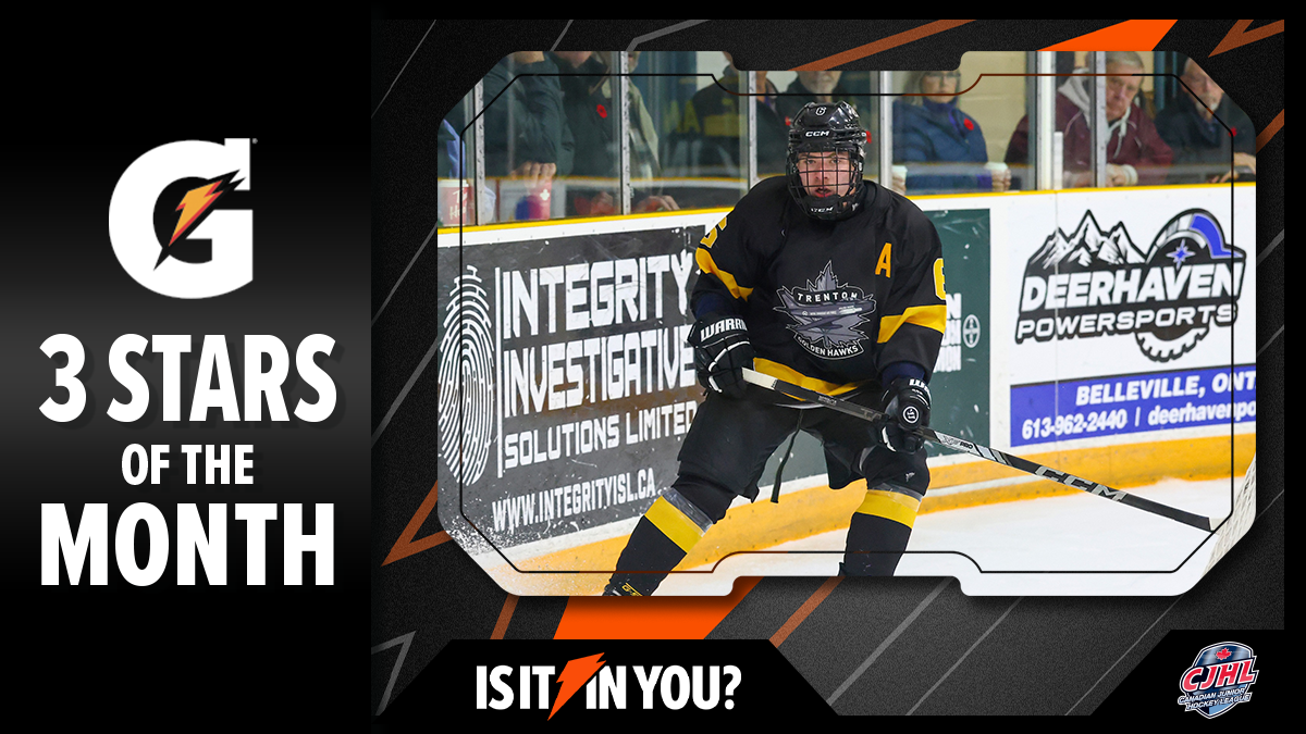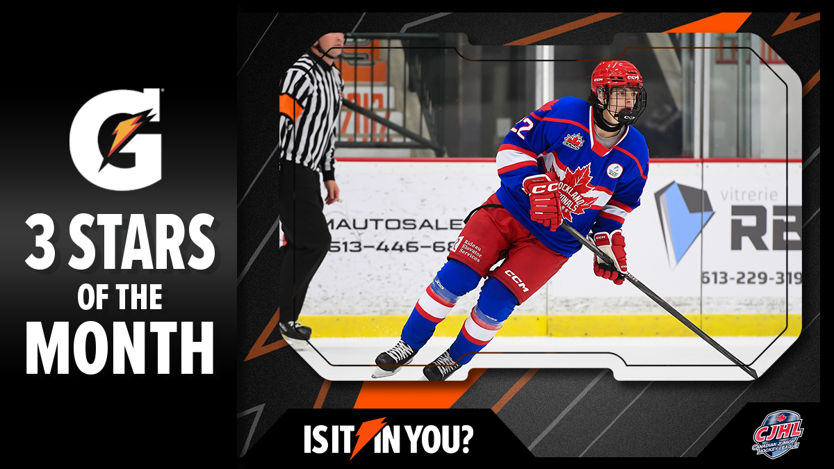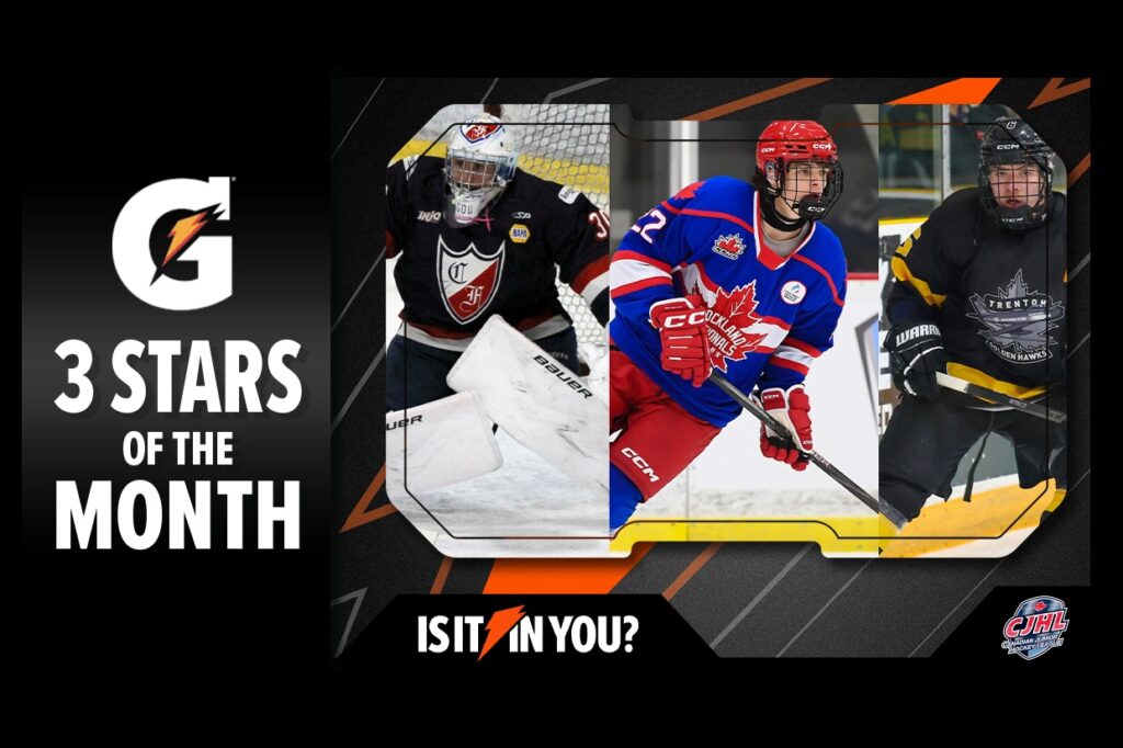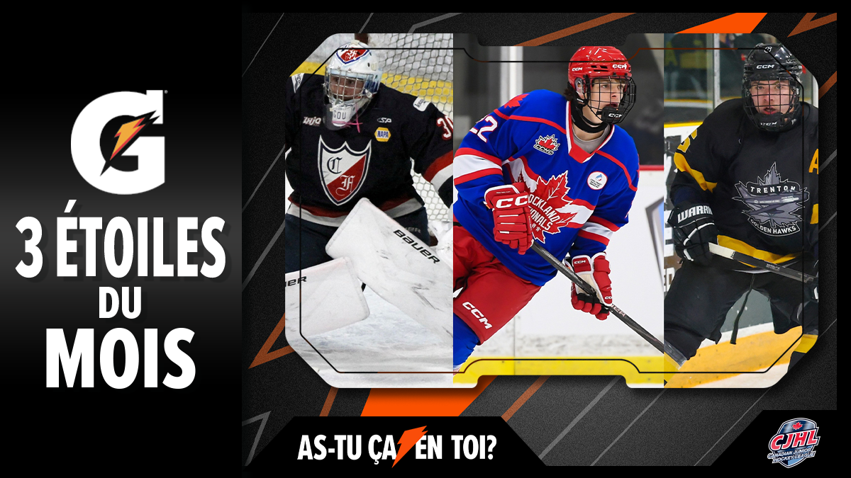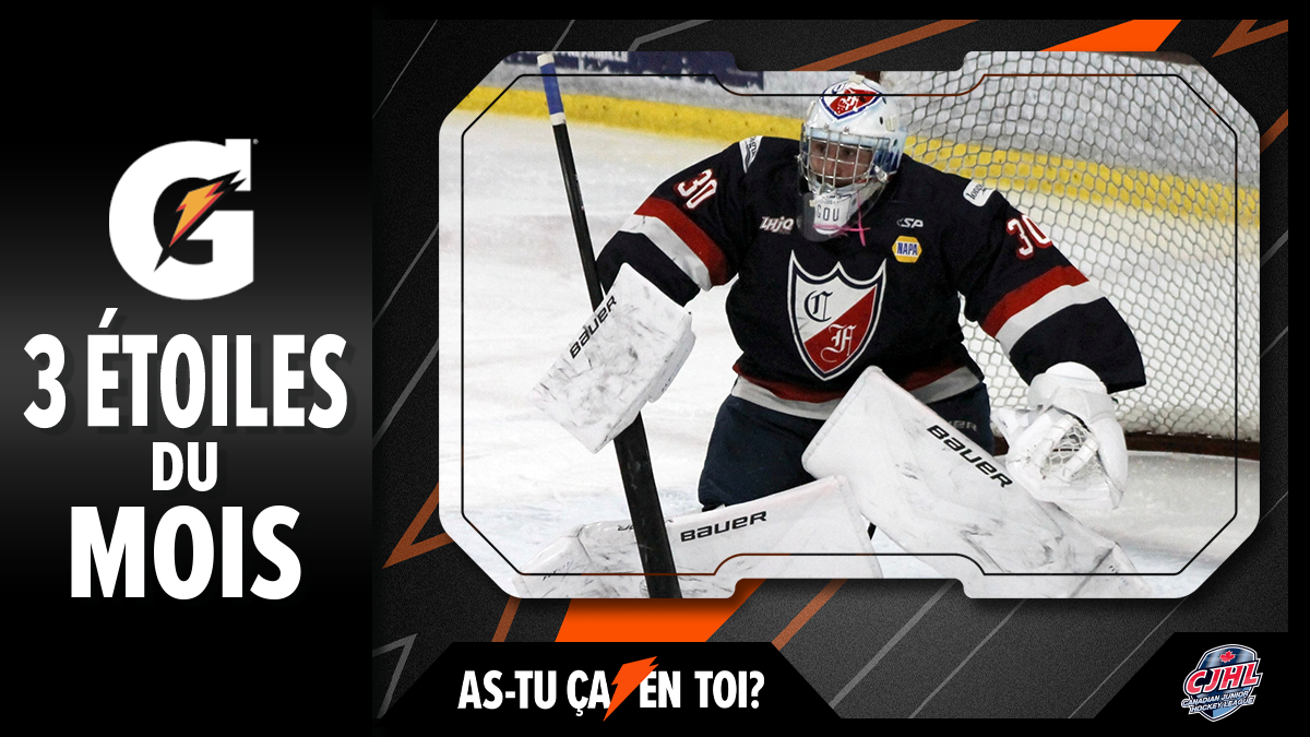 TORONTO – The Canadian Junior Hockey League (CJHL) announced Thursday that goaltender Mathis Lacroix-Goulet (Collège Français de Longueuil/LHJAAAQ) along with forwards Mavrick Brunet (Rockland Nationals/CCHL) and Taeo Artichuk (Trenton Golden Hawks/OJHL) have been named its 3 Stars of the Month – Fuelled by Gatorade, for October.